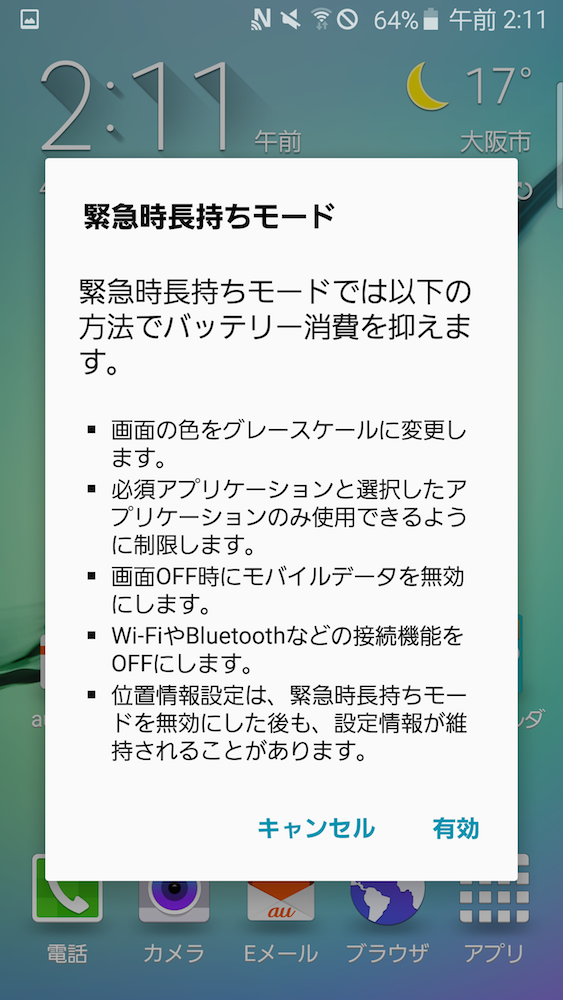 この機能も2013年発売のGALAXY Jあたりから搭載されていた機能。災害時にバッテリー節約のためこの機能をオンにすると30%の状態から5日間は持つそうです(電波状況・使用時間によって変動)。