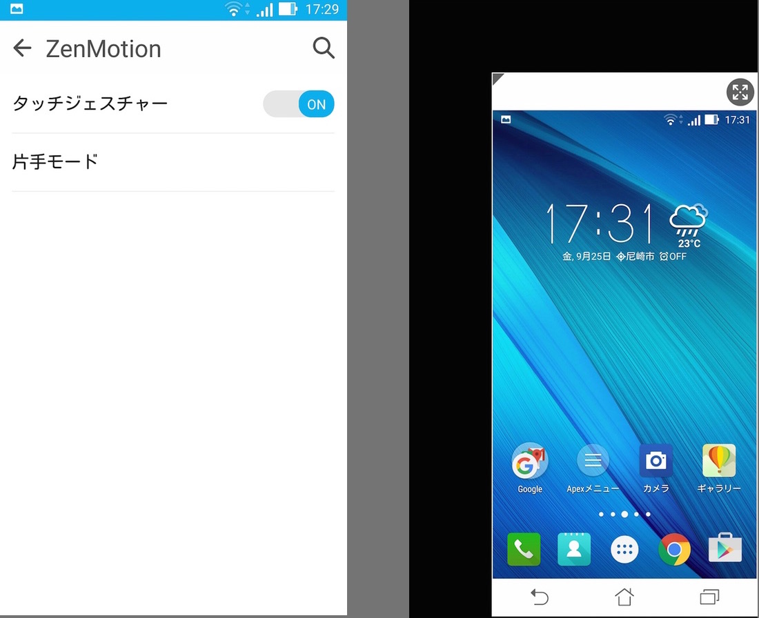 Zenfone Selfieは画面サイズが5.5インチと大きく、手の小さい方には持ちにくくなっていますが、Zen Motionの設定及びクイック設定の「片手操作」から片手モードの機能をオンにすると画面UIが縮小され片手でも操作しやすくなります。縮小後の画面はどこでも配置可能。