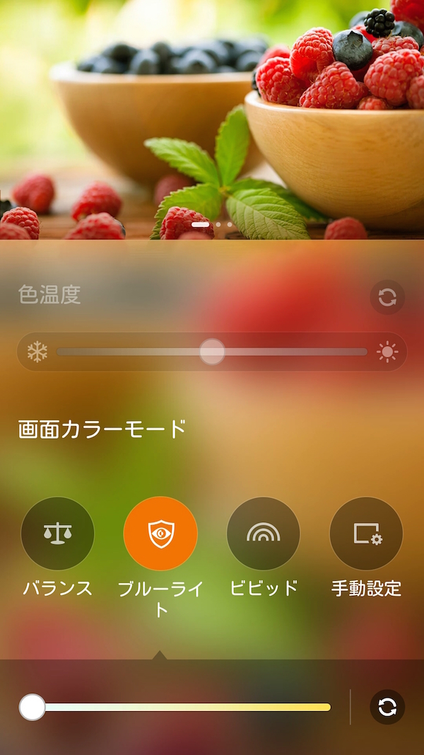 そのフィルターをディスプレイにかけてしまおうというのがこの「ブルーライトカットモード」。実際にオンにすると画面に茶色いフィルターがかかります。一部のXperiaもディスプレイの色温度を変更することができるので同じようなことが出来るかもしれません。