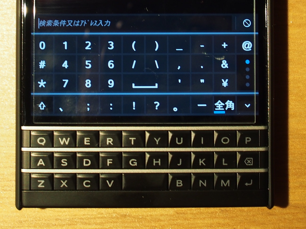 数字や記号などキーボード上に無いものは、画面に表示されます。Passportは横幅が広いので一度に表示できる記号の数も圧倒的。ただその分片手操作はほぼ不可能で、基本的に両手持ちで操作することになります。
