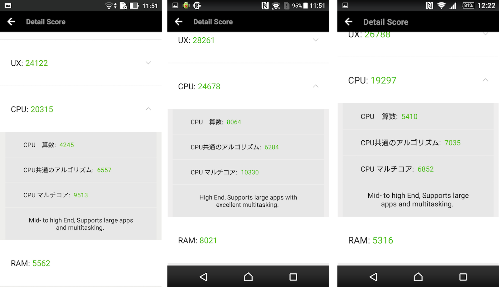 比較対象の2機種については、以前Snapdragon 650の性能を確かめた記事の計測結果を使用しようかと思いましたが、ソフトウェア更新などがあったので今回改めてやり直しました。