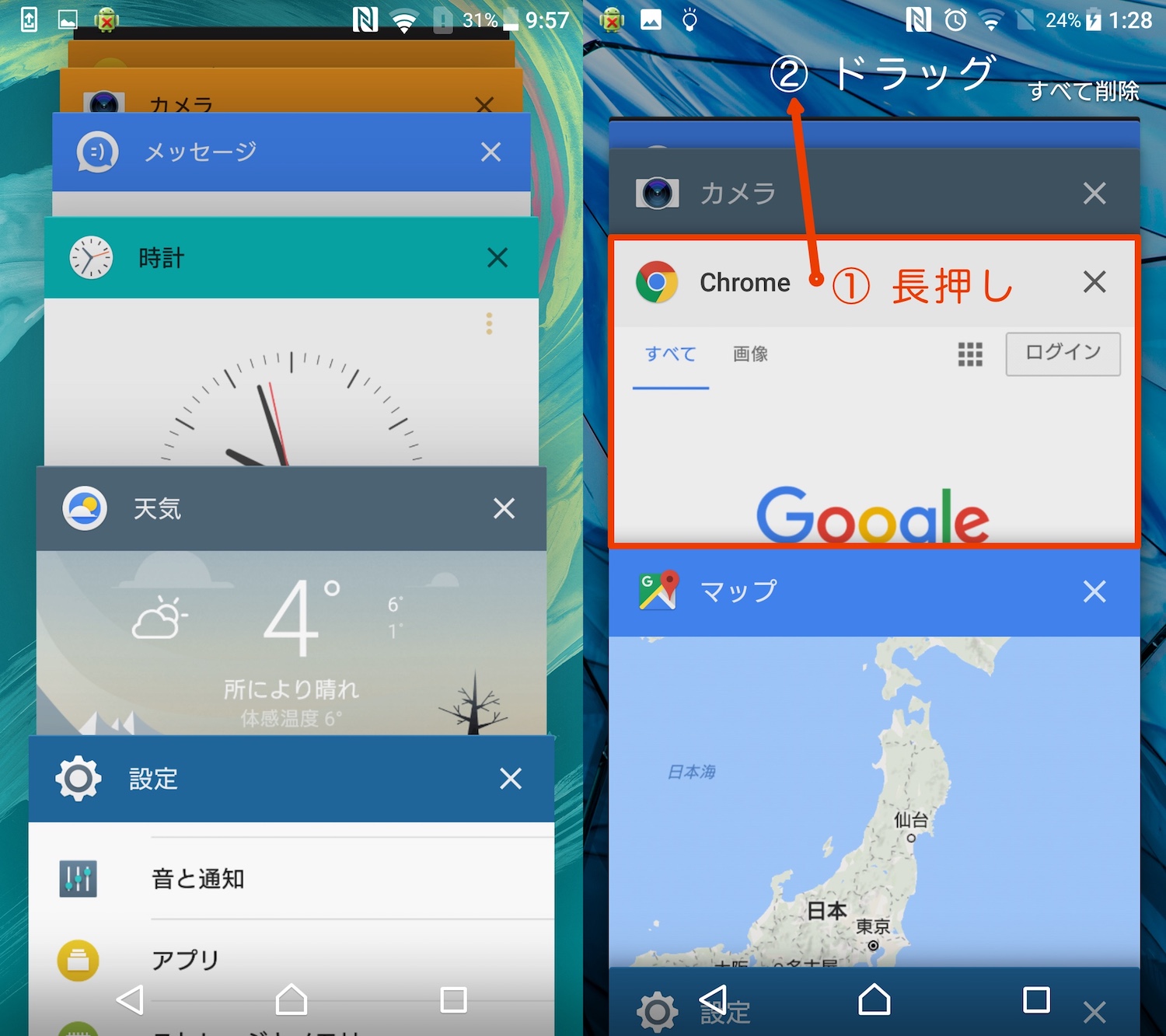 この機能はアプリを開いている時にタスクキー長押し、あるいはマルチタスク画面でカードを長押しし、ドラッグすることで利用できます。