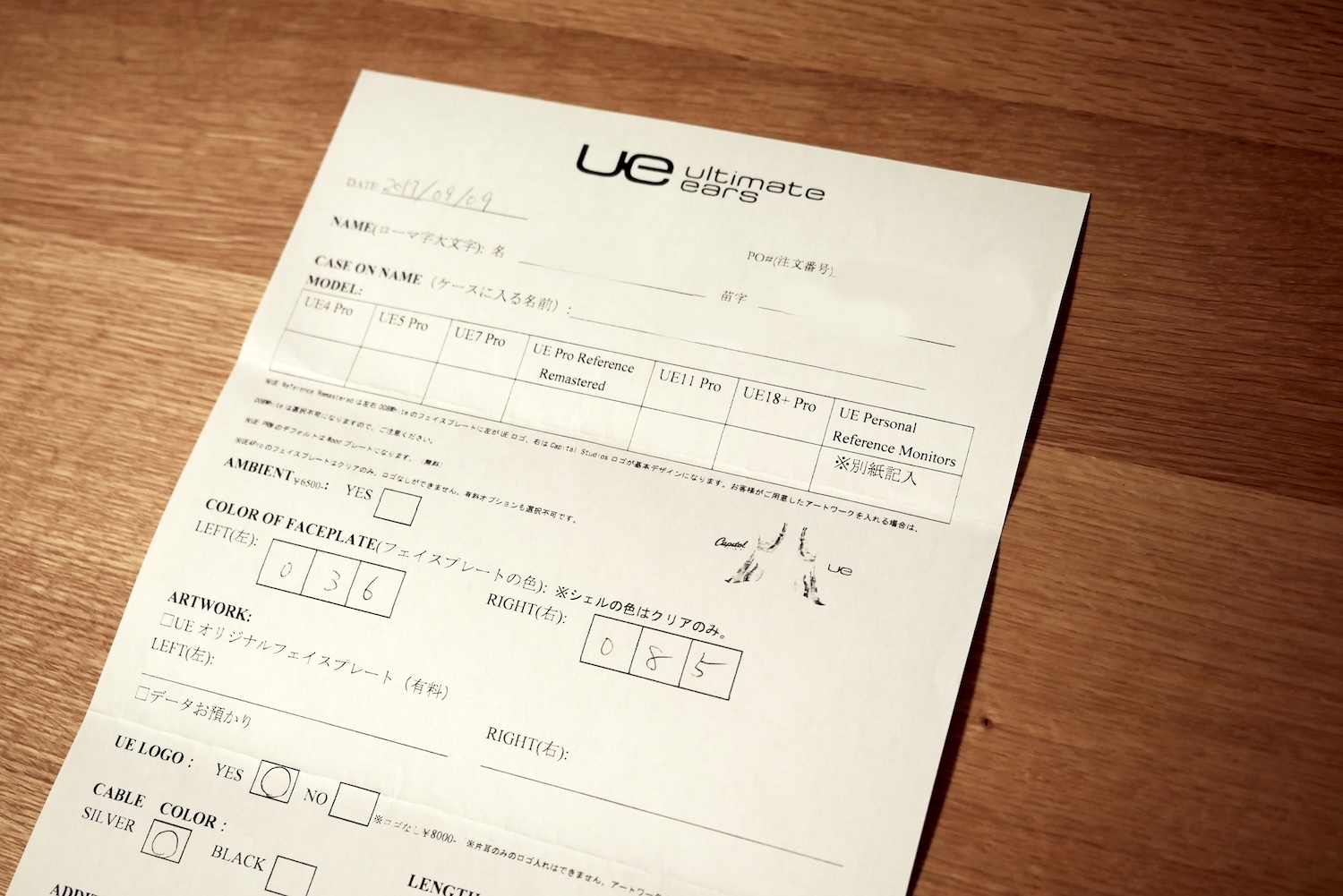 これが今回購入したUltimate Earsの実際の申込書。フェイスプレートはカラーのものを選択しましたが、自作のアイコン画像データを持ち込めばフェイスプレートにプリントしてくれるサービスもあります。