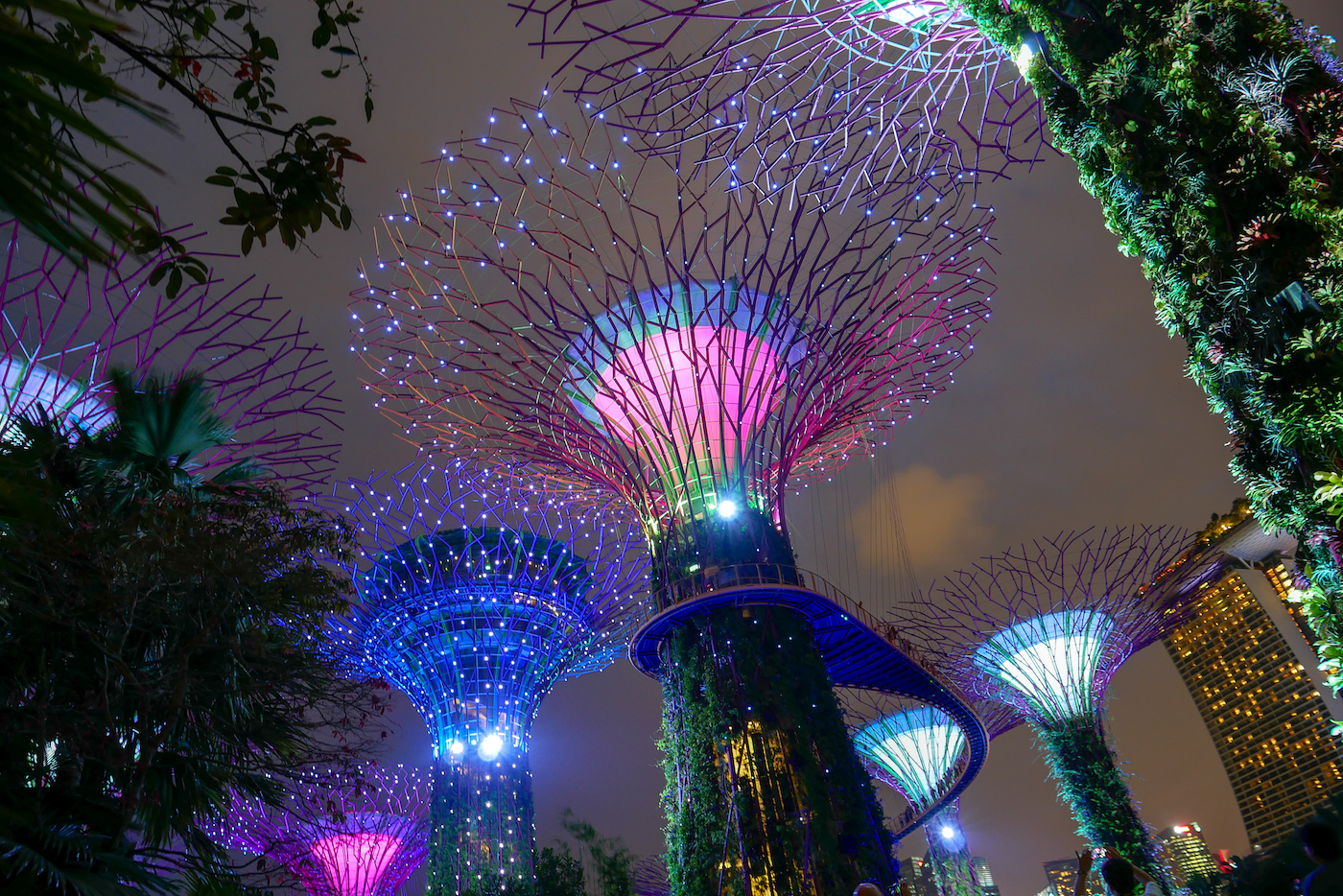 マリーナベイサンズのそばにある植物園「ガーデンズ・バイ・ザ・ベイ」。下の写真のような植物館以外はほぼ無料で立ち入ることができ、旅行客や地元の方の憩いの場所となっています。