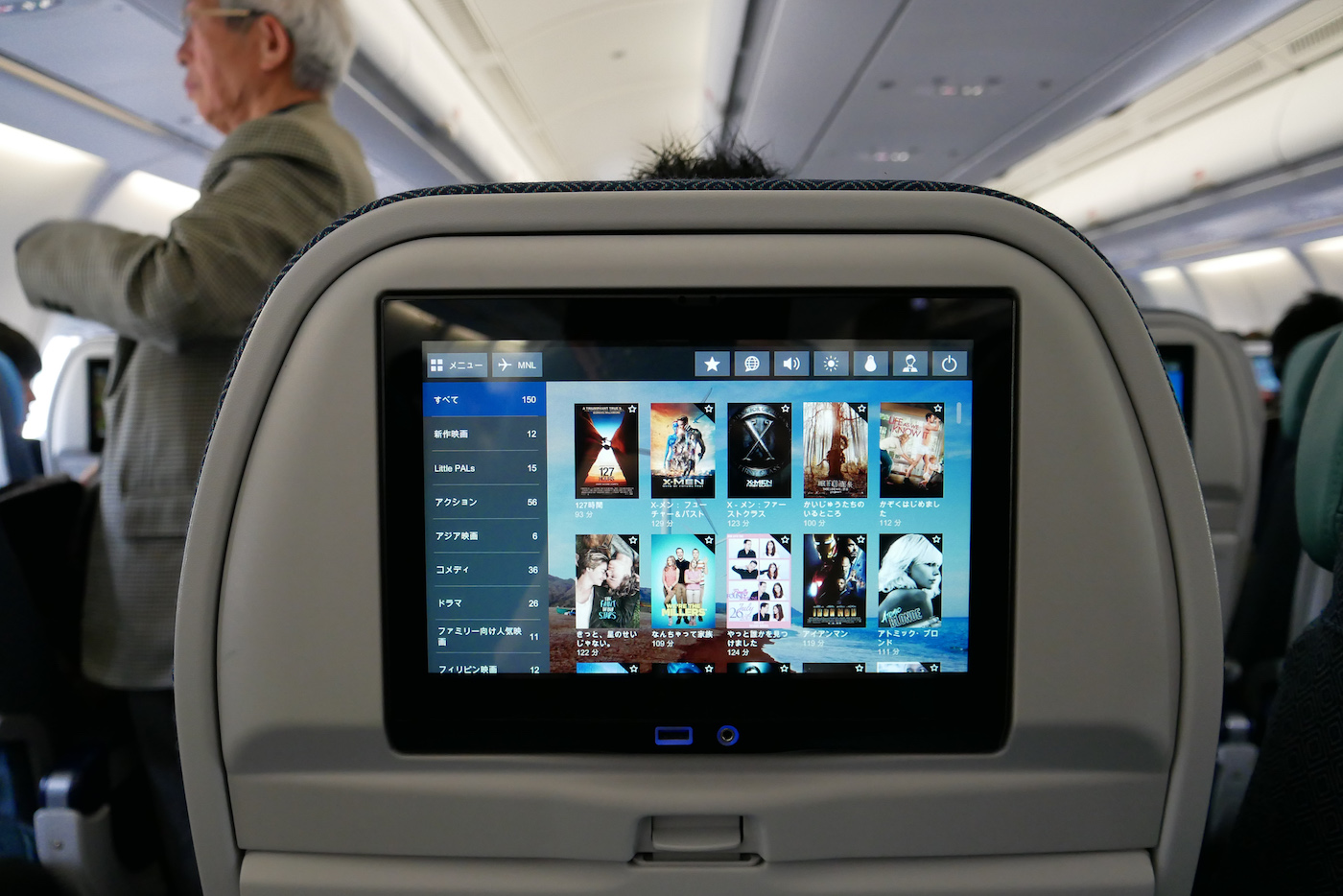 上の写真は行きの機内の様子。各座席にこうしたディスプレイがあり、映画や音楽、テレビ番組を観れるので、さほど苦にはなりませんでした。USBからはスマートフォンの充電も可能。