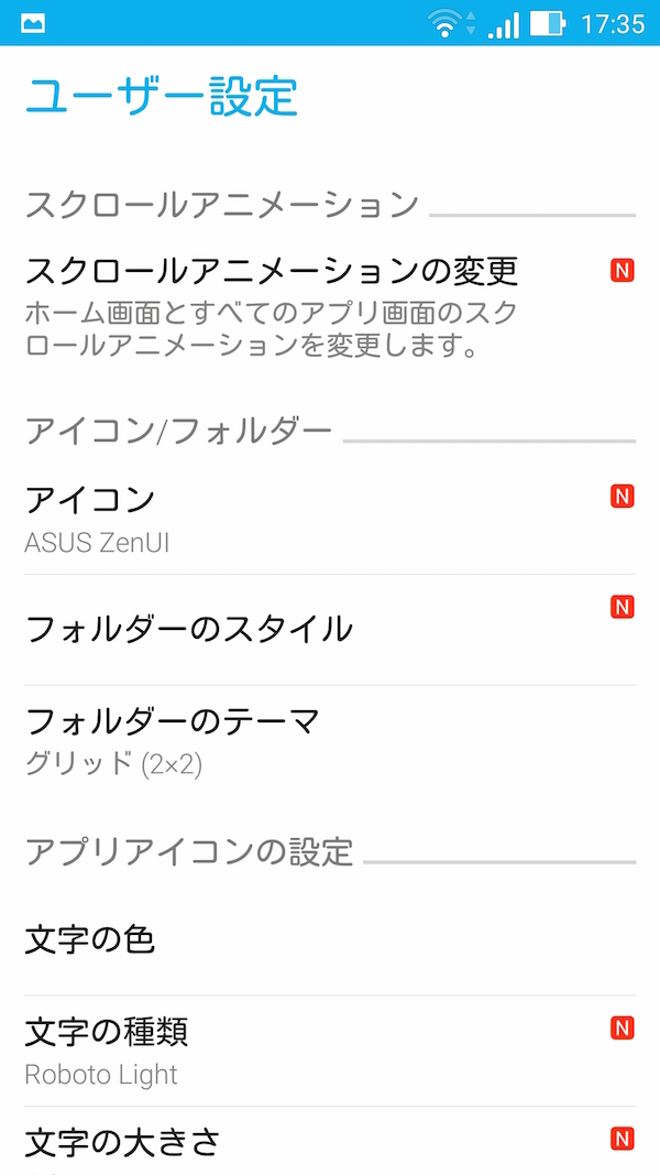 Zenfone Selfieに予めインストールされている純正のホームアプリ。メイン画面上で上にスワイプすると写真のような設定画面になります。純正のホームアプリにしてはかなり機能が充実しており、画面推移のエフェクト・アイコンのフォントのサイズ、色、種類の・スワイプダウン時の動作が変更できる他、個別のアプリにロックを掛けることもできます。