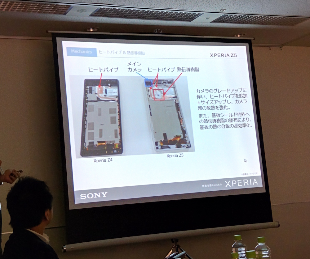 前回機種で話題になった発熱についての話。Xperia Z5では発熱対策のために熱を逃がす「ヒートパイプ」を搭載。カメラ付近に配置することによってカメラ使用時の発熱を抑える働きをします。