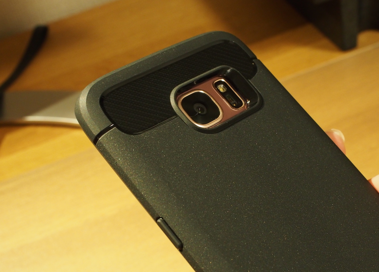 カメラ周りはこんな感じ。電源ボタンや音量ボタン部分は突起していますが、もともとエッジディスプレイのせいで側面が細くなっており、かなりボタン類が押しにくかったのでこれはこれで満足。