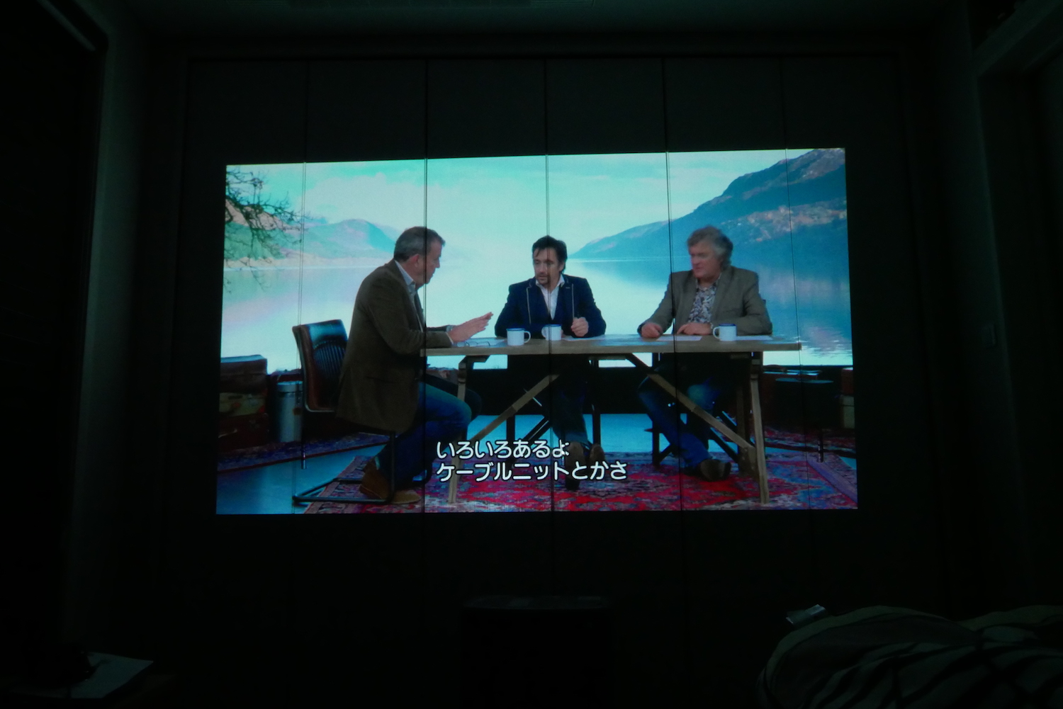 場所を少し変えてクローゼットのほうに投影。試しにAmazonプライムビデオの「グランドツアー」を流してみました。この大画面をベッドでゴロゴロしながら見るのは、もう最高。焦点さえ合わせれば解像度が低いとはあまり感じません。