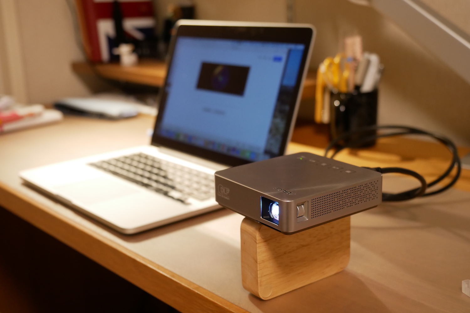 物は試し、ということで早速MacBookと接続して自室にて投影してみます。既に充電済みで繋ぐのはHDMIケーブルだけと見た目もスッキリ。高さを調節して、、いざ投影!