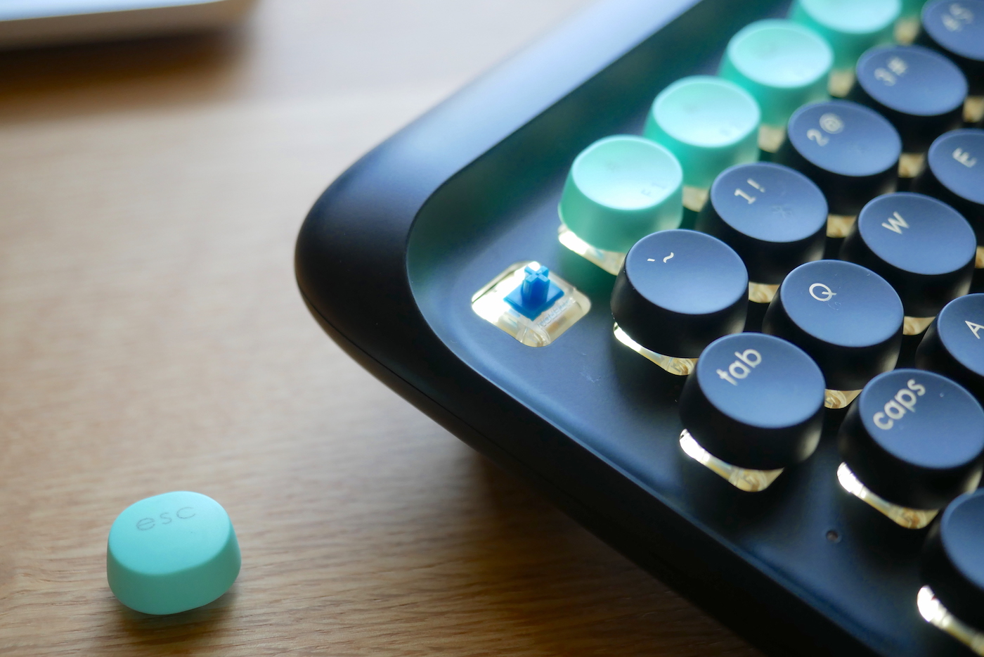 おまけとして入っていたキーキャップ。オーダーの段階で「何色が欲しい?」とのアンケートが来て、可愛らしい水色を選択しました。丸みを帯びていることもありラムネみたい。
