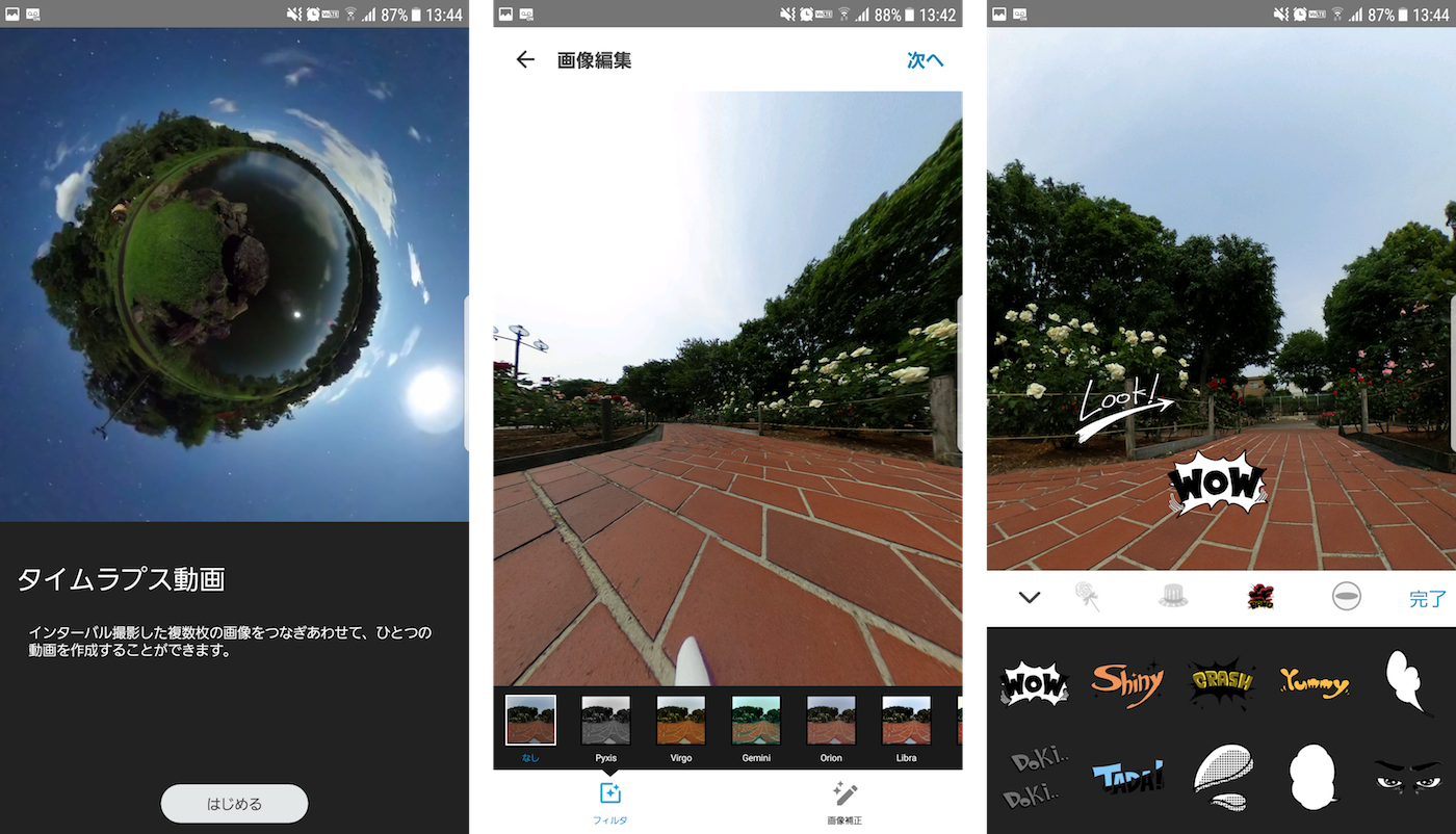 「THETA+」アプリではタイムラプス動画の作成や、撮影した写真にエフェクトを掛けたりスタンプや文字を挿入することが可能。