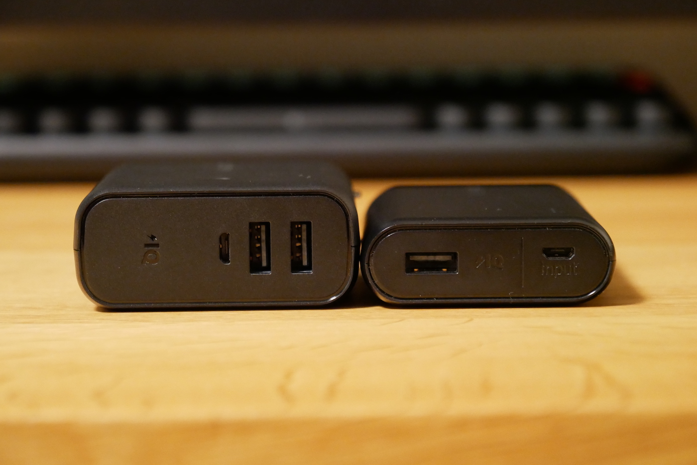 横から見比べても5000の方が分厚さがあります。給電口のUSBポートは2つあるので、普段ACアダプターとして使うにも良いですね。